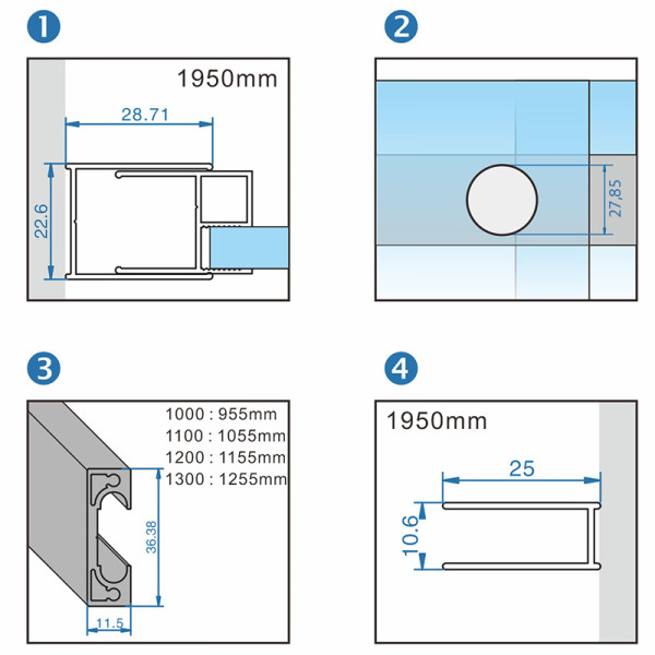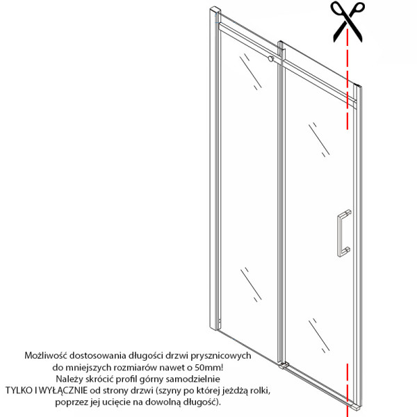 * Możliwość dostosowania długości drzwi prysznicowych do mniejszych rozmiarów nawet o 50mm! Należy skrócić profil górny samodzielnie TYLKO I WYŁĄCZNIE od strony drzwi (szyny po której jeżdżą rolki, poprzez jej ucięcie na dowolną długość).