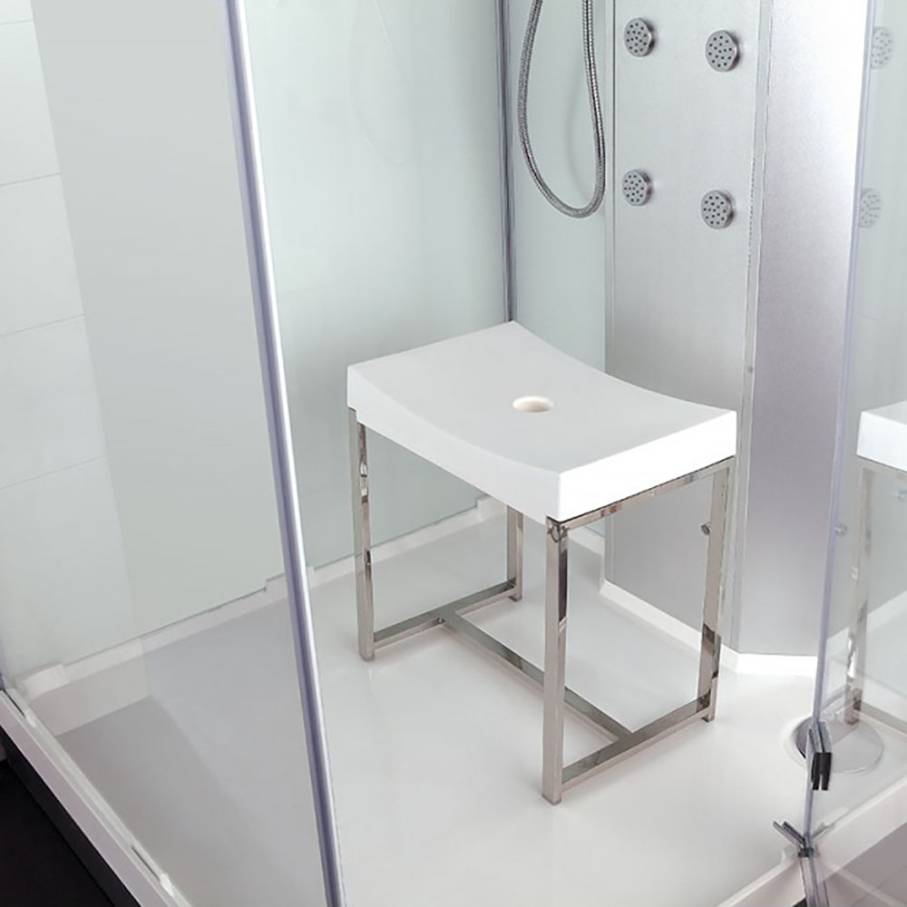 Krzesło do kabiny prysznicowej wykonane ze stali nierdzewnej i siedzisko w kolorze białym.