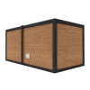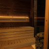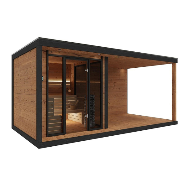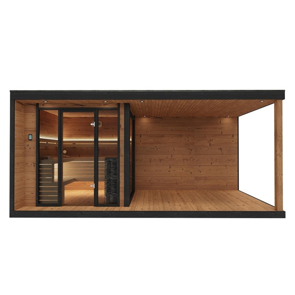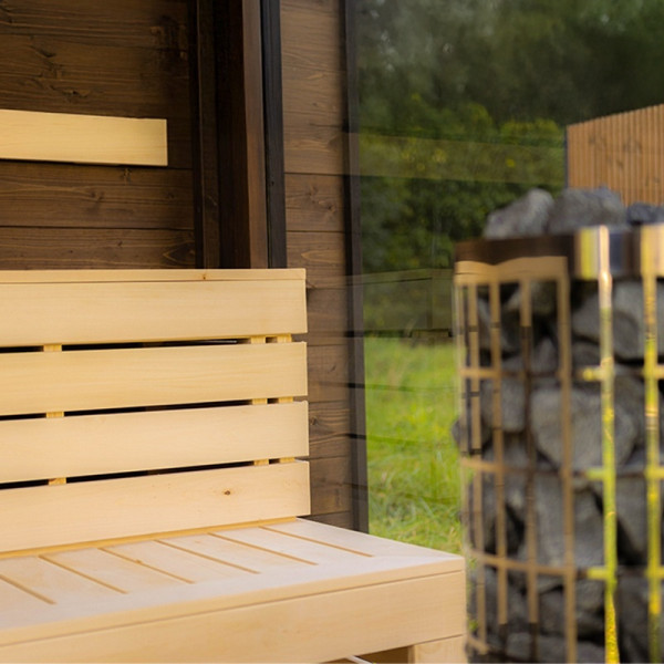Elegancki, ciemny odcień drewna – do złudzenia przypominający efekt drewna termowanego – uzyskiwany jest dzięki najwyższej klasy środkom ochronnym marki Tikkurila, które są w pełni bezpieczne do stosowania w wysokich temperaturach panujących w saunie (powyżej 110°C). Zarówno drzwi, jak i panoramiczne okna wykonane zostały z 8-milimetrowego szkła hartowanego w przyciemnionym odcieniu Antisol Grafit, co nie tylko podkreśla nowoczesny wygląd sauny, ale też zwiększa jej bezpieczeństwo użytkowania.