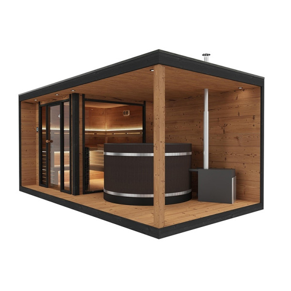 Sercem konstrukcji jest wysokiej klasy piec Harvia Cilindro o mocy 9 kW – model, który wyróżnia się imponującą ilością kamieni (ponad 100 kg). Tak duża masa nagrzewająca przekłada się na dłuższą żywotność urządzenia i stabilniejsze warunki kąpieli parowych. Sterowanie piecem odbywa się za pomocą wodoodpornego, dotykowego panelu firmy FFES, który – dzięki opcji zdalnego sterowania przez internet – pozwala na pełną kontrolę nad sauną z dowolnego miejsca.