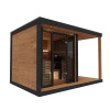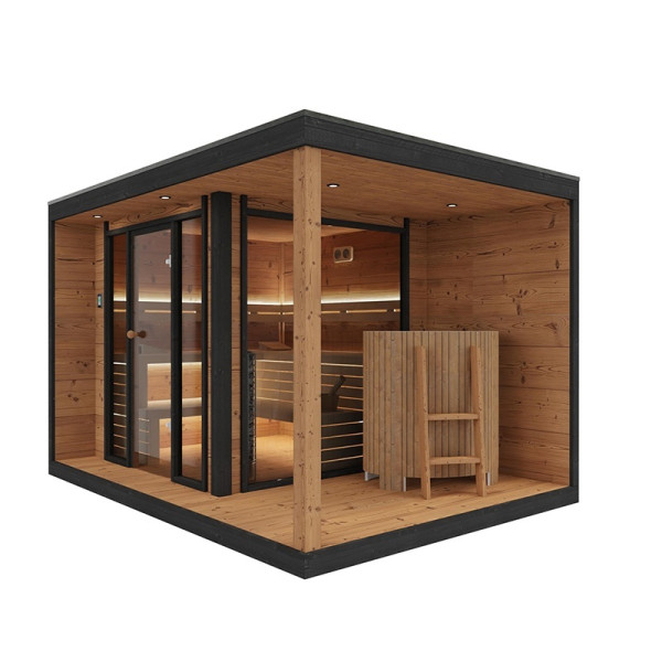 Sauna ogrodowa Wandai to kompaktowa propozycja, która wprowadza do przydomowej przestrzeni klimat prawdziwego ogrodowego SPA. Zintegrowany taras pozwala na rozszerzenie zestawu o beczkę do schładzania, co stanowi doskonałe uzupełnienie rytuałów saunowych i podnosi komfort użytkowania.