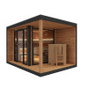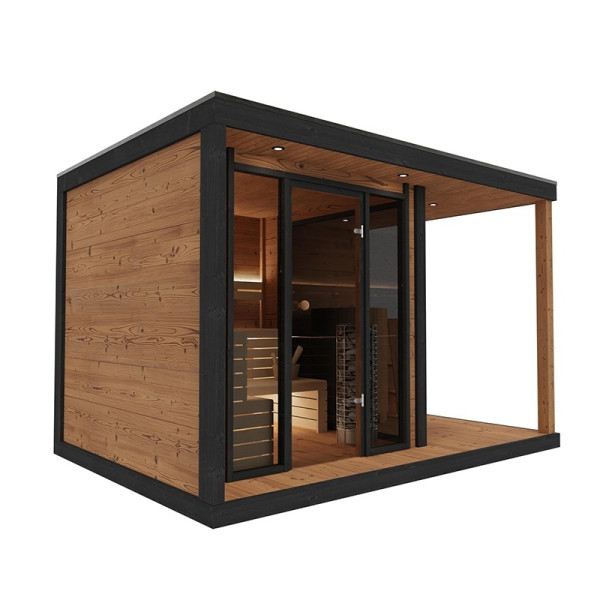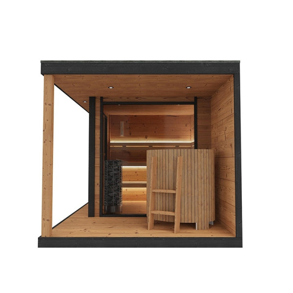 Elegancki, ciemny odcień drewna – do złudzenia przypominający efekt drewna termowanego – uzyskiwany jest dzięki najwyższej klasy środkom ochronnym marki Tikkurila, które są w pełni bezpieczne do stosowania w wysokich temperaturach panujących w saunie (powyżej 110°C). Zarówno drzwi, jak i panoramiczne okna wykonane zostały z 8-milimetrowego szkła hartowanego w przyciemnionym odcieniu Antisol Grafit, co nie tylko podkreśla nowoczesny wygląd sauny, ale też zwiększa jej bezpieczeństwo użytkowania.