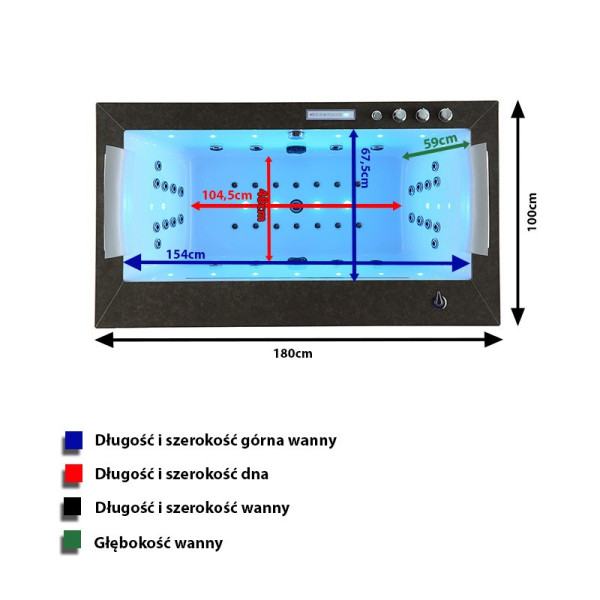 * koloroterapia z 14 światłami LED wewnątrz wanny oraz 4 dyszami powietrznymi z wielokolorowym oświetleniem LED