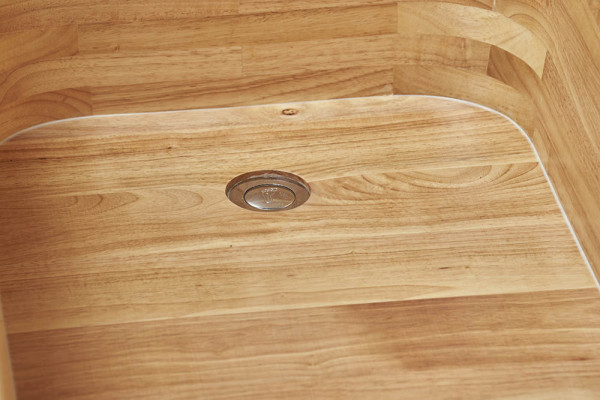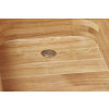 Wnętrze wyposażone jest w ergonomiczne drewniane siedzisko oraz wygodną poduszkę pod kark wykonaną z antypoślizgowej skóry syntetycznej. Na spodzie znajduje się okrągły odpływ ze stali nierdzewnej – trwały, łatwy do czyszczenia i estetyczny.