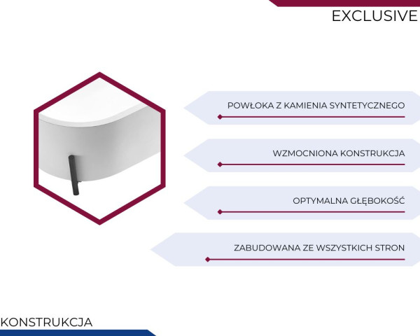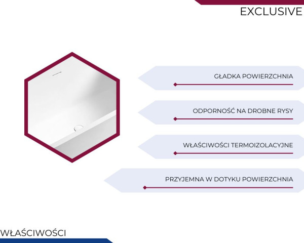 Seria EXCLUSIVE to kwintesencja luksusu i nowoczesnego wzornictwa. Wanny wykonane z matowego kamienia syntetycznego zachwycają elegancją, trwałością i dopracowanym w każdym detalu designem. Połączenie kamienia wzmocnionego żywicą i pigmentem nadaje im subtelny, satynowy połysk i szlachetny wygląd, który podkreśla ich ekskluzywny charakter. To propozycja dla osób, które cenią połączenie estetyki, komfortu i prestiżu w wyjątkowej formie stworzonej z myślą o nowoczesnych wnętrzach.