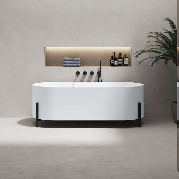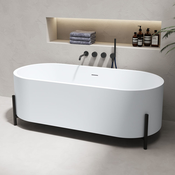 Owalny kształt wanny z kamienia syntetycznego to harmonijne połączenie elegancji i komfortu. Delikatnie zaokrąglone linie sprzyjają naturalnemu ułożeniu ciała, zapewniając pełen relaks i wygodę podczas kąpieli. Opływowa forma dodaje wnętrzu lekkości i nowoczesnego charakteru, doskonale komponując się zarówno z minimalistycznymi, jak i luksusowymi aranżacjami łazienek.