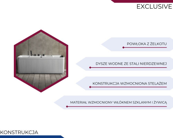 Powłoka z żelkotu to trwałe i estetyczne wykończenie, które zapewnia wannie wysoką odporność na zarysowania, przebarwienia i codzienne użytkowanie. Dzięki doskonałym właściwościom termoizolacyjnym długo utrzymuje ciepło wody, podnosząc komfort kąpieli. Gładka, nieporowata powierzchnia jest łatwa w czyszczeniu i pozwala zachować nieskazitelny wygląd wanny przez długie lata.