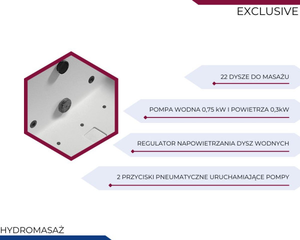 Wanna wyposażona jest w pompę wodną o mocy 0,75 kW oraz pompę powietrza o mocy 0,3 kW, które wspólnie zapewniają efektywny i komfortowy masaż wodny oraz powietrzny. Takie połączenie gwarantuje odpowiednią siłę strumienia wody i delikatny masaż bąbelkowy, sprzyjający rozluźnieniu mięśni i głębokiemu relaksowi. To niezawodne rozwiązanie, które podnosi jakość każdej kąpieli i pozwala w pełni cieszyć się domowym spa.