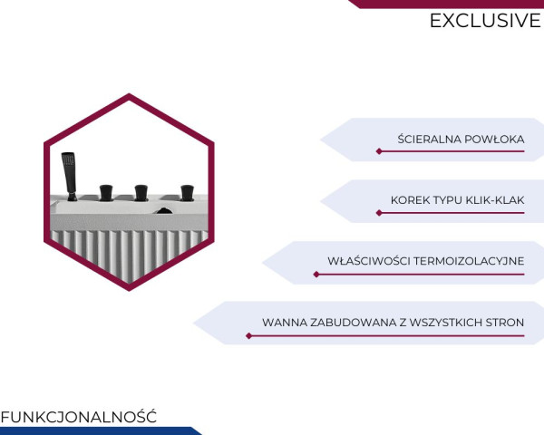 Dzięki doskonałym właściwościom termoizolacyjnym, wanna skutecznie zatrzymuje ciepło, co pozwala cieszyć się dłuższą kąpielą bez potrzeby dolewania gorącej wody. To rozwiązanie, które zapewnia komfort termiczny, a przy okazji pozwala oszczędzać wodę i energię – idealne dla osób kochających długie, relaksujące kąpiele.
