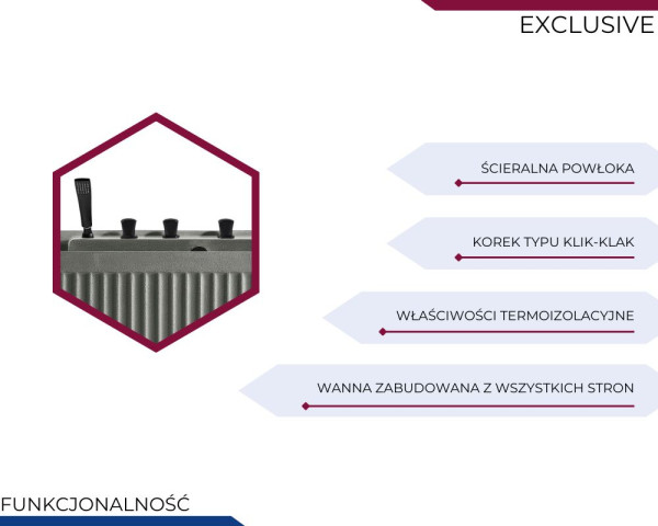 Dzięki doskonałym właściwościom termoizolacyjnym, wanna skutecznie zatrzymuje ciepło, co pozwala cieszyć się dłuższą kąpielą bez potrzeby dolewania gorącej wody. To rozwiązanie, które zapewnia komfort termiczny, a przy okazji pozwala oszczędzać wodę i energię – idealne dla osób kochających długie, relaksujące kąpiele.