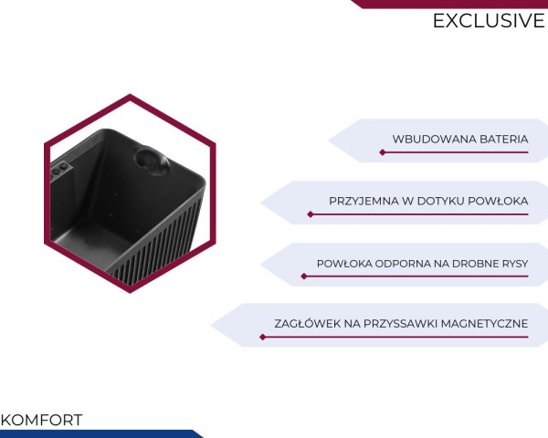 Zagłówek, wykonany z materiałów odpornych na działanie wody i wilgoci, zapewnia komfort nawet podczas długich kąpieli. Dzięki magnetycznym przyssawkom, zagłówek pewnie utrzymuje się w wybranym miejscu, oferując stabilne wsparcie dla głowy i szyi. Jest to szczególnie korzystne przy hydromasażu, ponieważ pomaga rozluźnić mięśnie po ciężkim dniu, umożliwiając pełne odprężenie ciała i umysłu.
