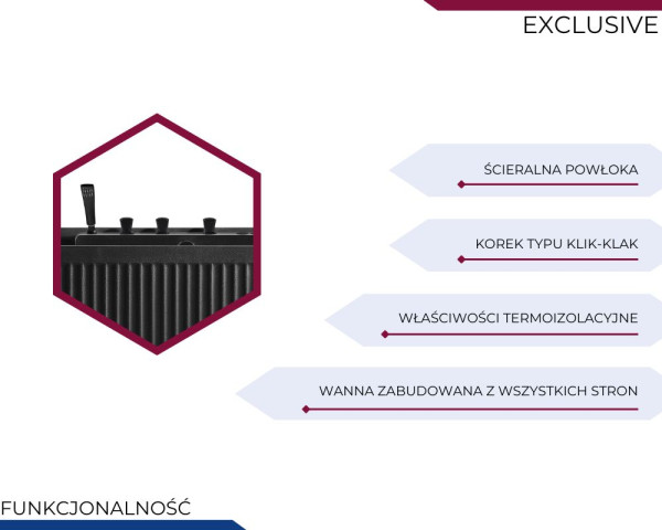 Dzięki doskonałym właściwościom termoizolacyjnym, wanna skutecznie zatrzymuje ciepło, co pozwala cieszyć się dłuższą kąpielą bez potrzeby dolewania gorącej wody. To rozwiązanie, które zapewnia komfort termiczny, a przy okazji pozwala oszczędzać wodę i energię – idealne dla osób kochających długie, relaksujące kąpiele.