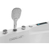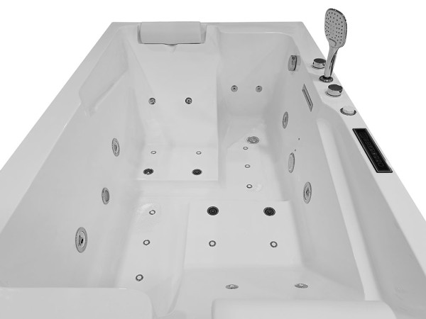 Model wyposażono w panel sterowania, baterię termostatyczną, słuchawkę prysznicową oraz dwa wygodne zagłówki, które zwiększają komfort podczas dłuższych kąpieli. Wbudowane radio, Bluetooth i głośnik pozwalają stworzyć relaksującą atmosferę z ulubioną muzyką. Regulacja napowietrzania umożliwia precyzyjne dopasowanie intensywności masażu do indywidualnych preferencji, a system grawitacyjnego osuszania przewodów wspiera higienę instalacji. Dodatkowo zastosowany system AUTO-CLEAN automatycznie dba o czystość rur i dysz wodnych po zakończonej kąpieli, znacząco ograniczając konieczność ręcznej konserwacji. To komfortowa wanna SPA dla dwóch osób, łącząca przestronny format, nowoczesne funkcje hydromasażu i wysoki poziom higieny użytkowania.