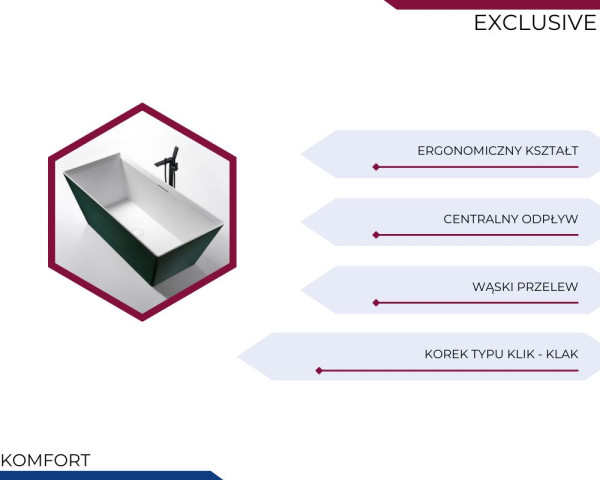 Seria EXCLUSIVE to najwyższej jakości materiały, innowacyjne rozwiązania, a także wyjątkowy element wystroju każdej łazienki, który spełnia oczekiwania najbardziej wymagających użytkowników. Wybierając wannę wolnostojąca z kolekcji EXCLUSIVE, inwestujesz w luksusowy komfort, który będzie służył latami, zachowując swoją estetyczną formę.