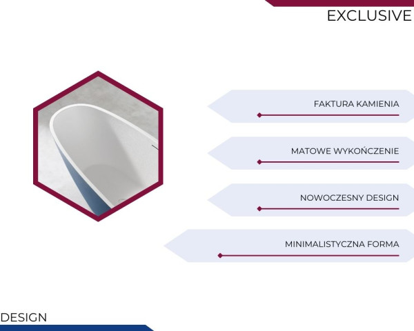 Powierzchnia wanny, inspirowana fakturą kamienia, nadaje jej elegancki i naturalny wygląd, który doskonale komponuje się z nowoczesnymi oraz klasycznymi aranżacjami wnętrz. Delikatnie wyczuwalna struktura dodaje stylowego charakteru, a jednocześnie jest przyjemna w dotyku. Kamienna faktura sprawia, że wanna nie tylko zachwyca estetyką, ale także zapewnia komfortowe i relaksujące doznania podczas kąpieli.